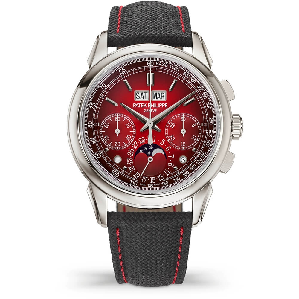外周に向かって濃くなるブラック・グラデーションのラック・レッド、ホワイトゴールド・ファセット仕上げ《オビュ》(弾丸)型植字アワーマーカー、タキメーター目盛 ホワイトゴールド・ファセット仕上げドフィーヌ型時・分針