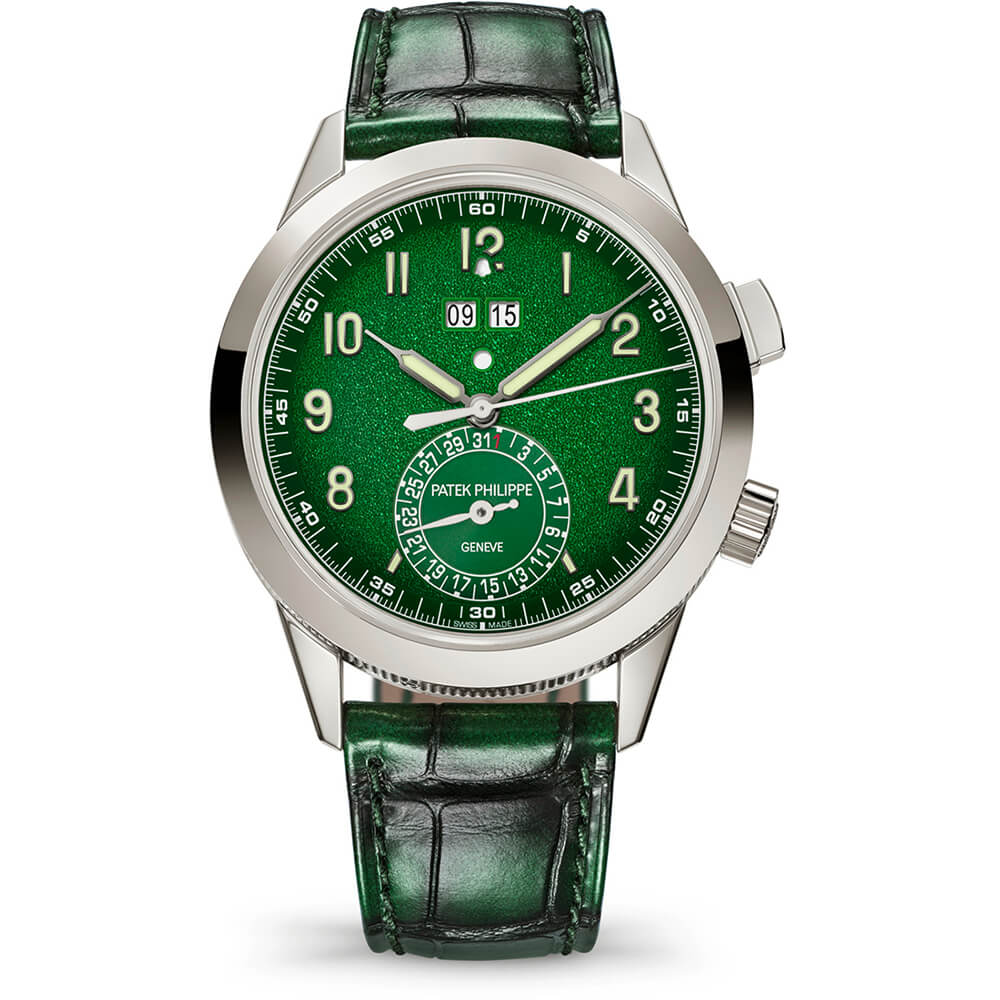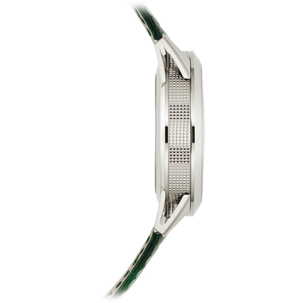 外周に向かって濃くなるブラック・グラデーションのテクスチャード・ラック・グリーン、夜光付ホワイトゴールド植字数字 夜光付ホワイトゴールド・シリンジ(注射器)型時・分針