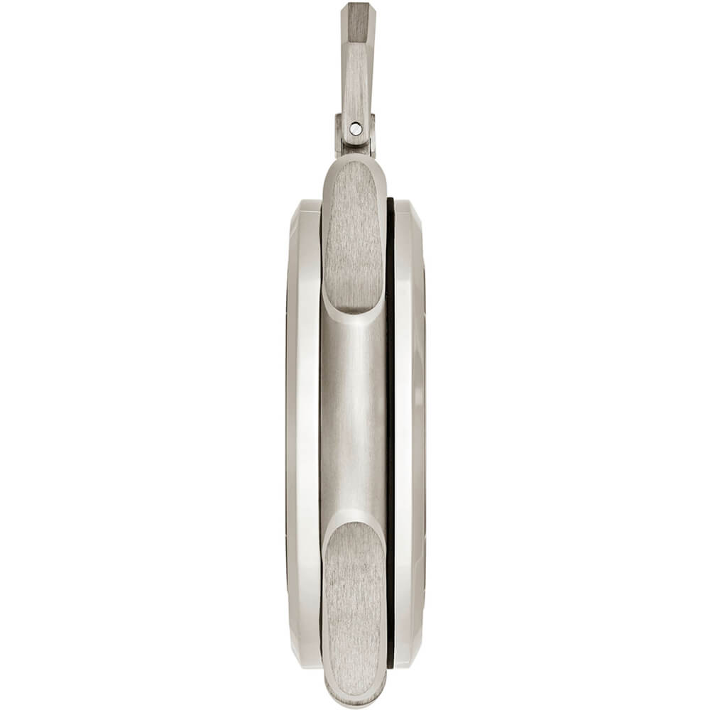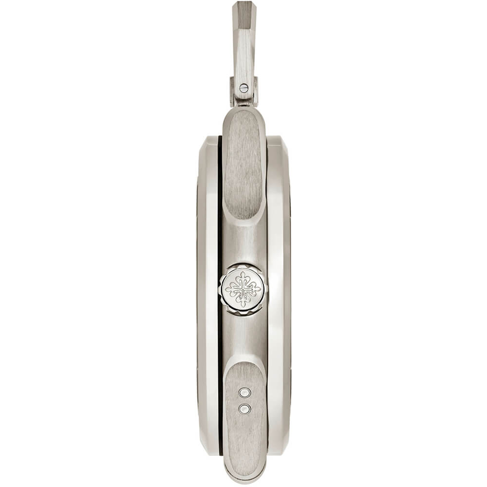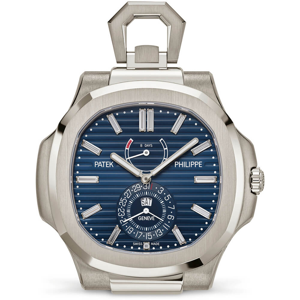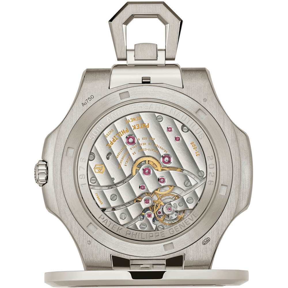 ヒンジ付ダストカバーで保護されたサファイヤクリスタル・バック ケースバックの外周に《50th Anniversary Nautilus 1976-2026 Patek Philippe》の銘入り。ブルー・ソレイユの水平エンボス・パターン、ホワイトゴールドのサテン仕上げの植字カラトラバ十字を配した、支えとして機能するヒンジ付カバー
