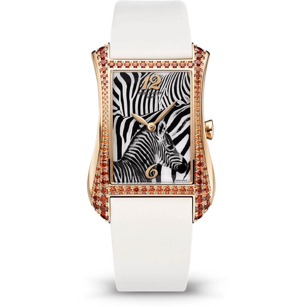メタライズ加工サファイアクリスタル製ダイヤル、ゼブラモチーフ(両面に彫刻とブラック・ニス塗装)、ローズゴールド製植字ブレゲ数字
