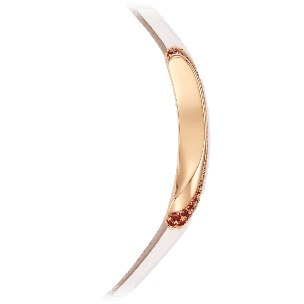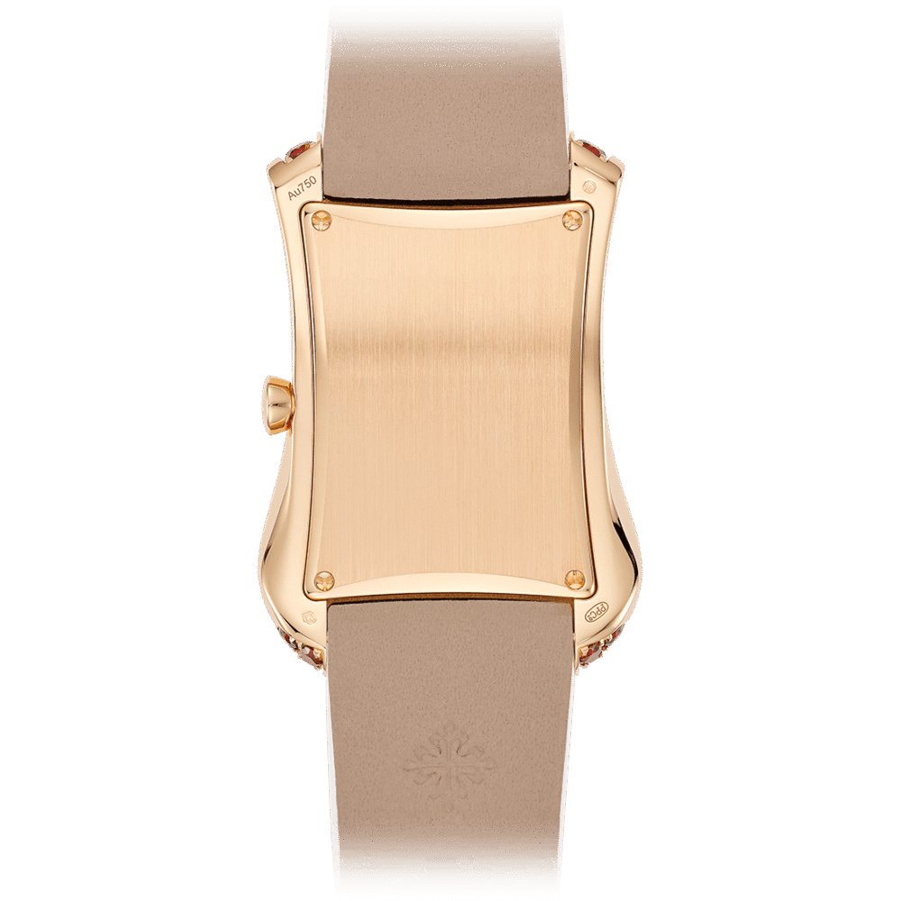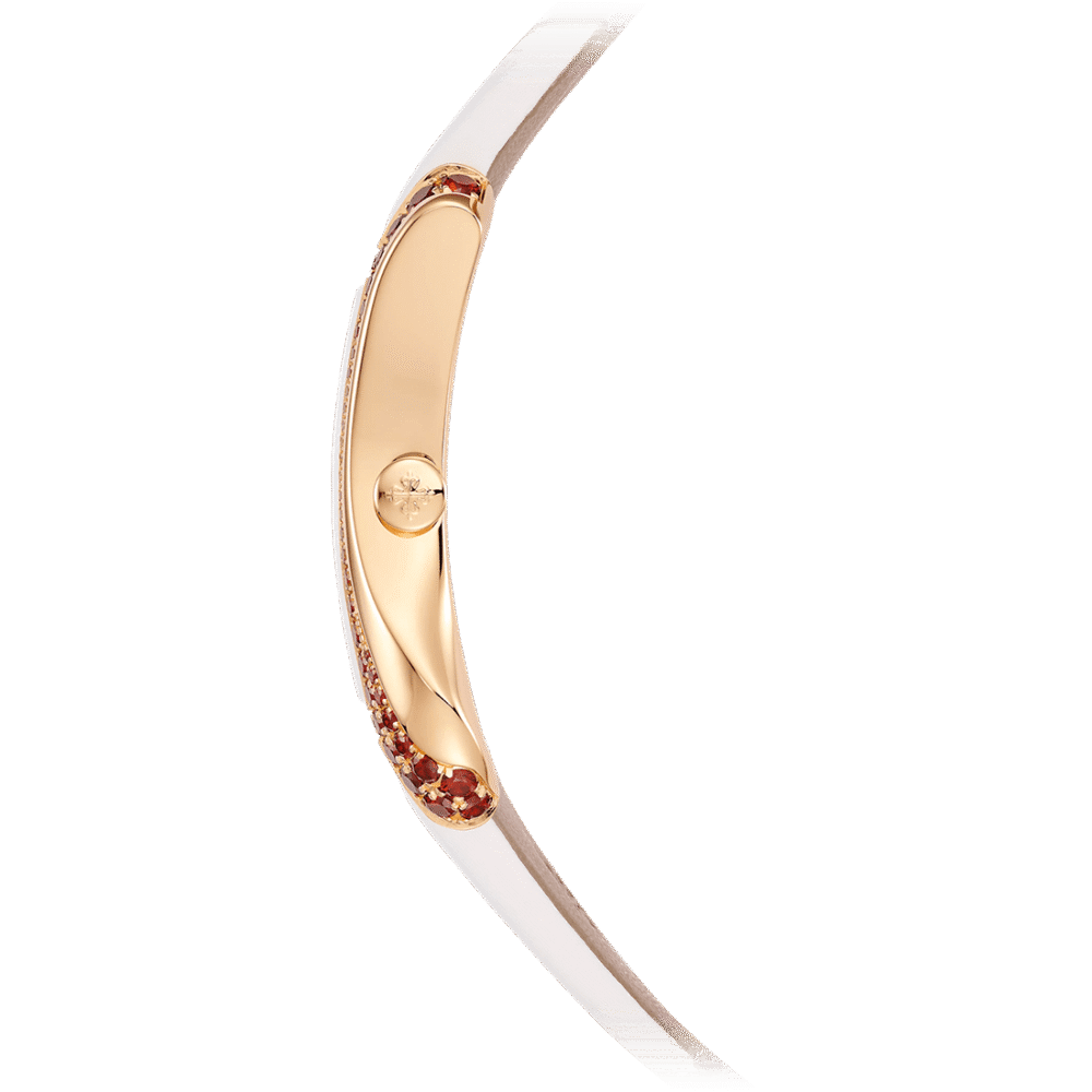ローズゴールド製のケースには、コニャックからタンジェリンへと移ろう二重のカラ―グラデーションを描くように、94個(計2.02カラット)のブリリアントカット・スペサルタイトがセッティングされています。